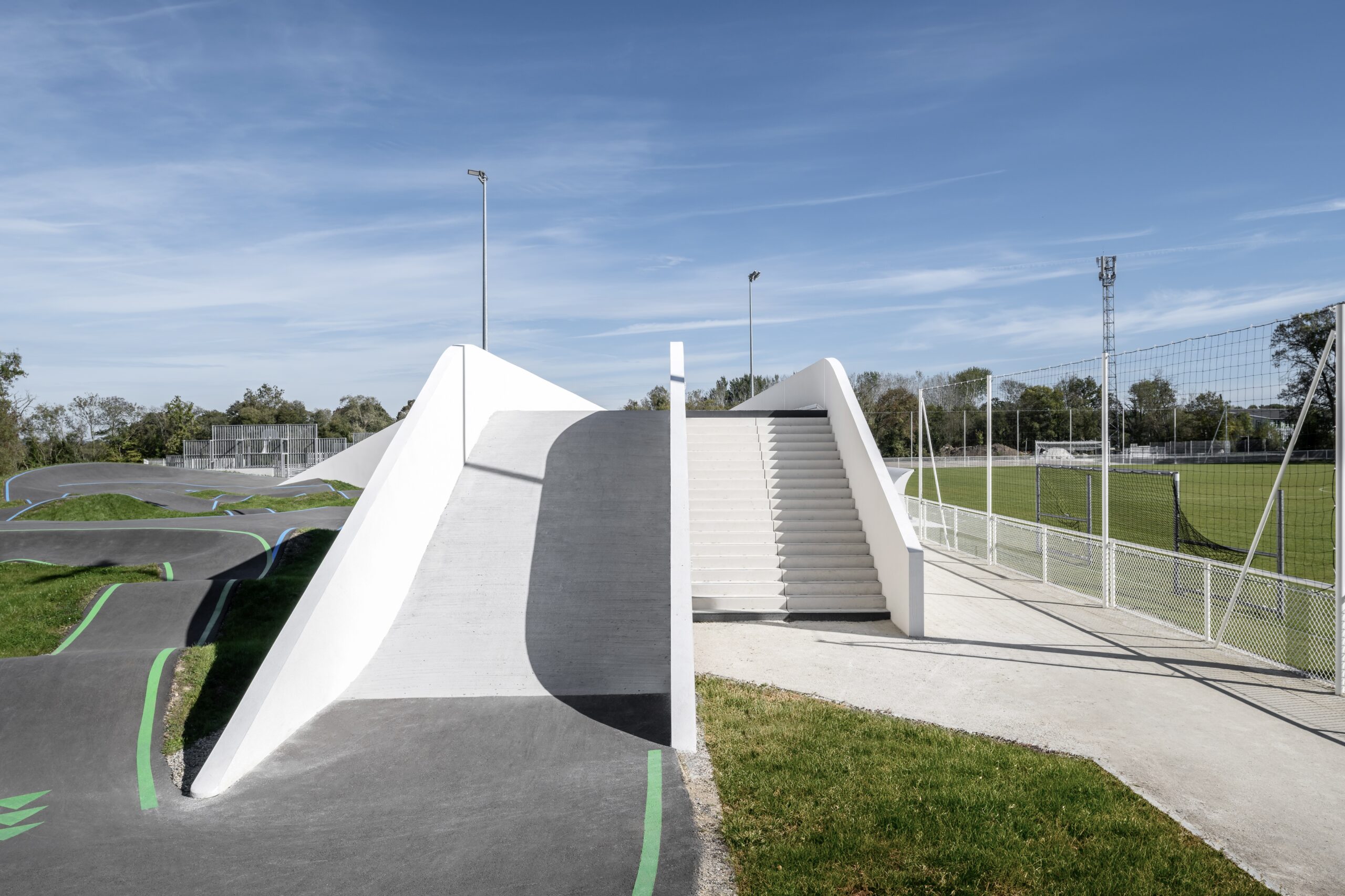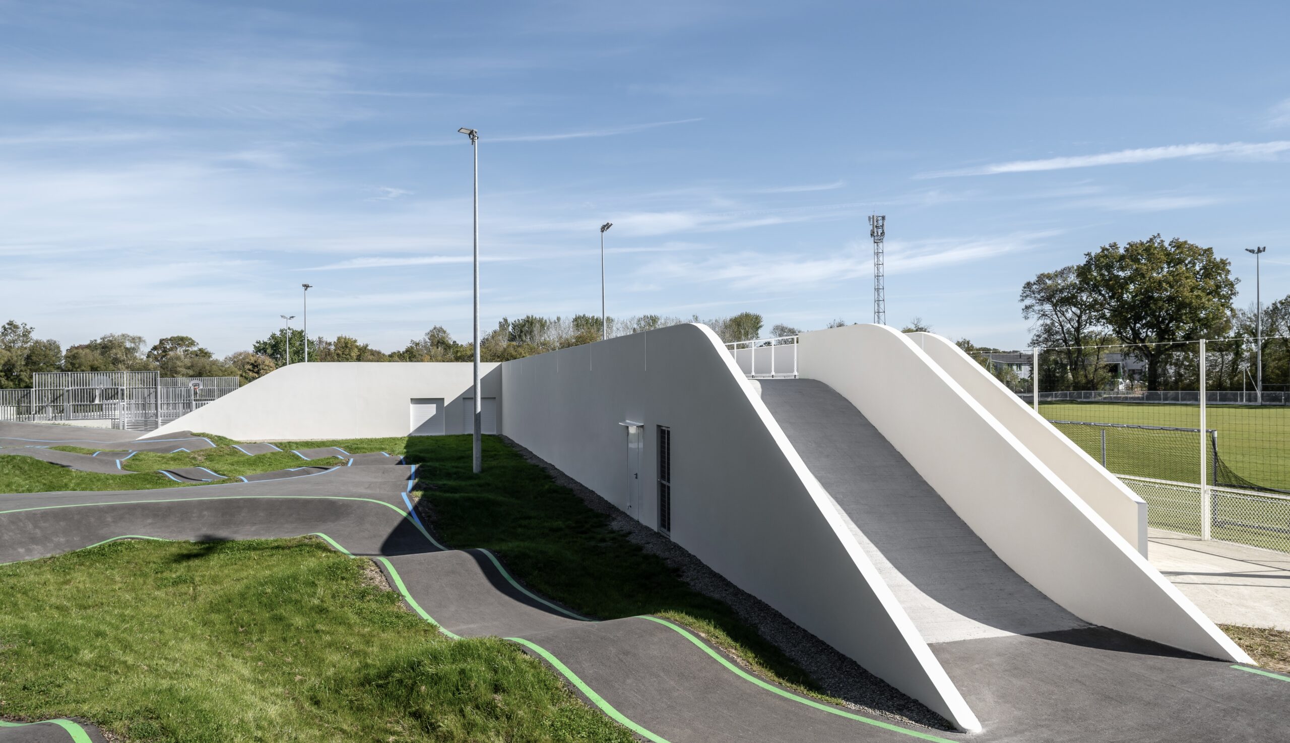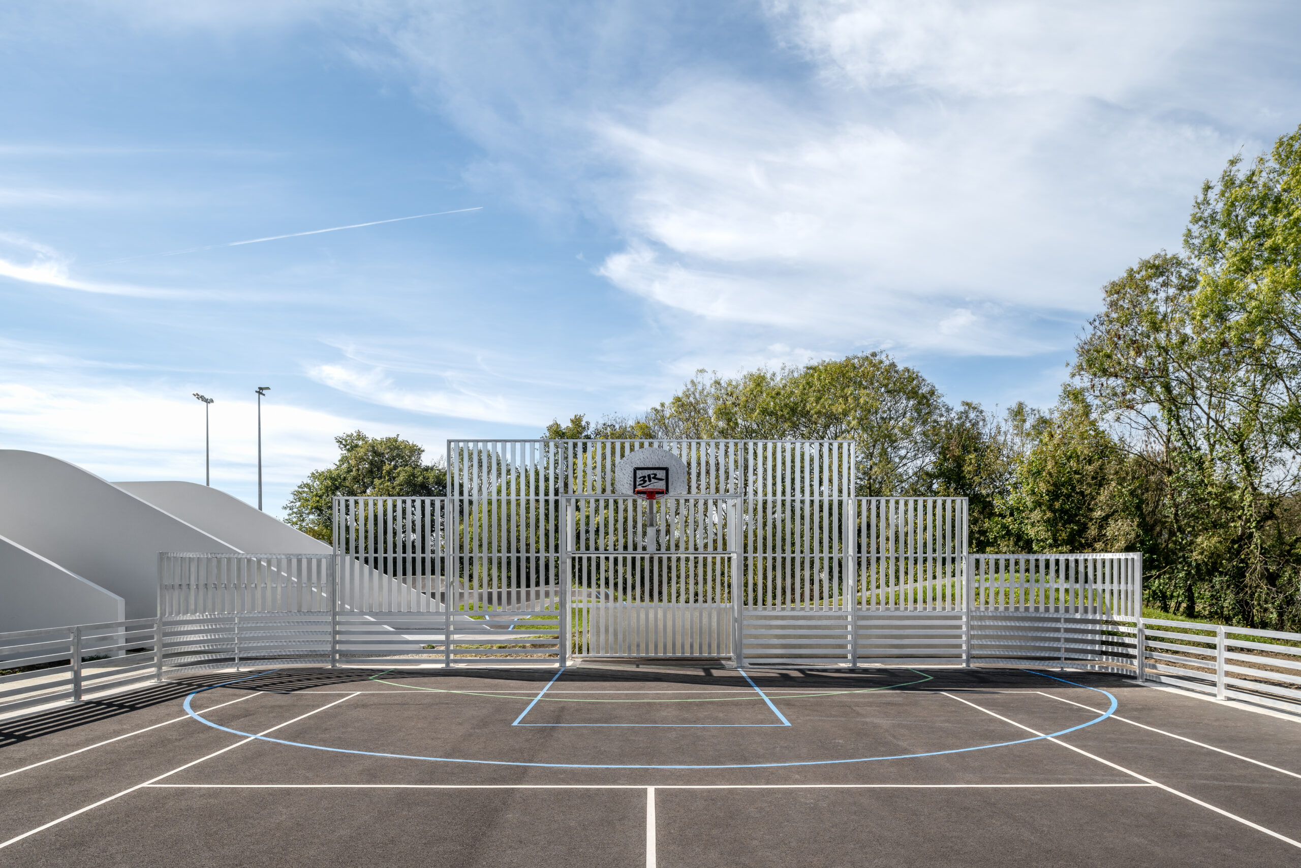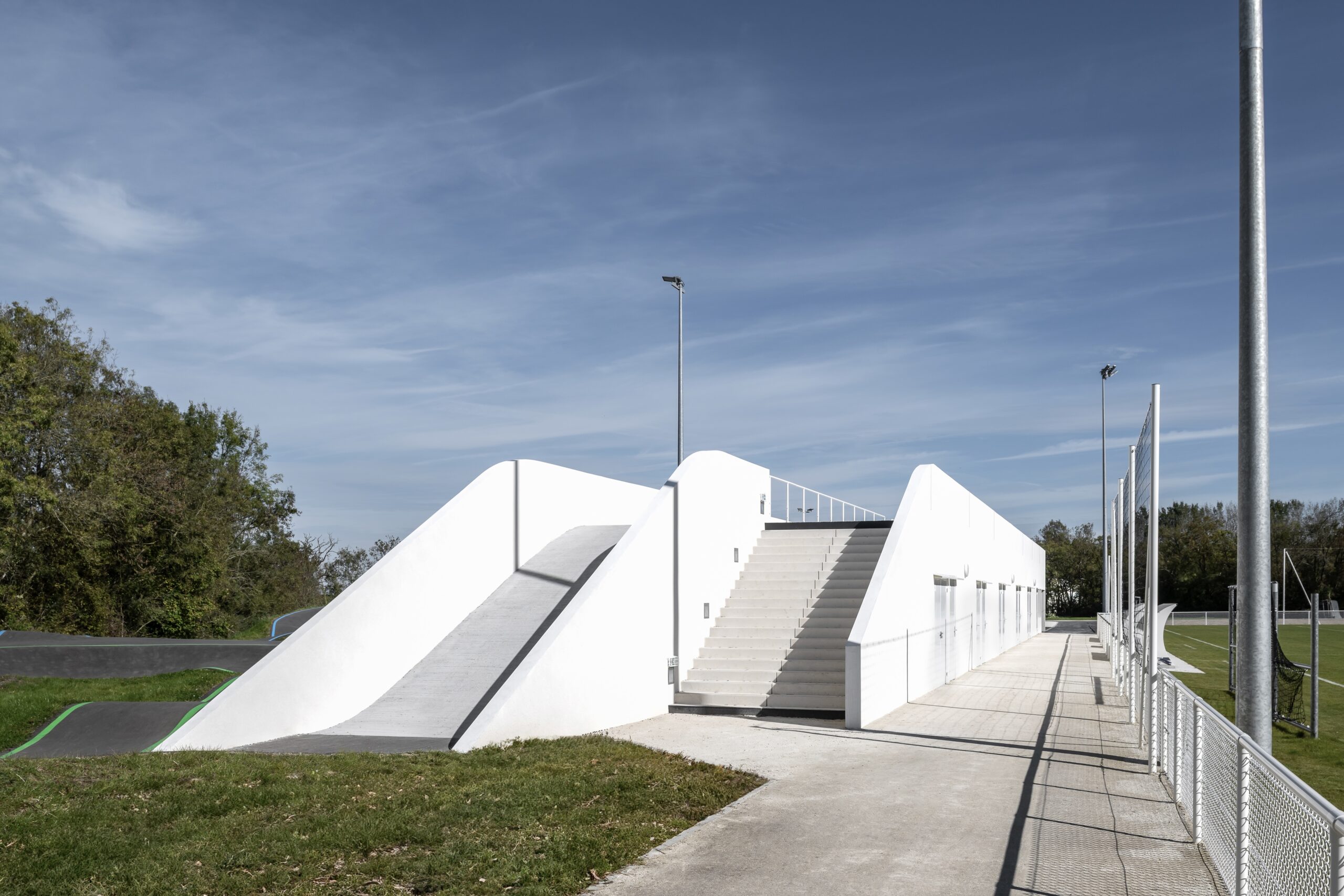 L’élément identitaire du projet réside dans le parcours de pumptrack dont la rampe de départ est intégrée à la toiture du bâtiment. Cette fusion architecture/paysage crée un design ludique et reconnaissable, tout en offrant un point de vue sur l’ensemble du complexe. Plus qu’une simple rénovation, l’intervention fait du site un lieu fédérateur, dynamique et emblématique pour la commune.