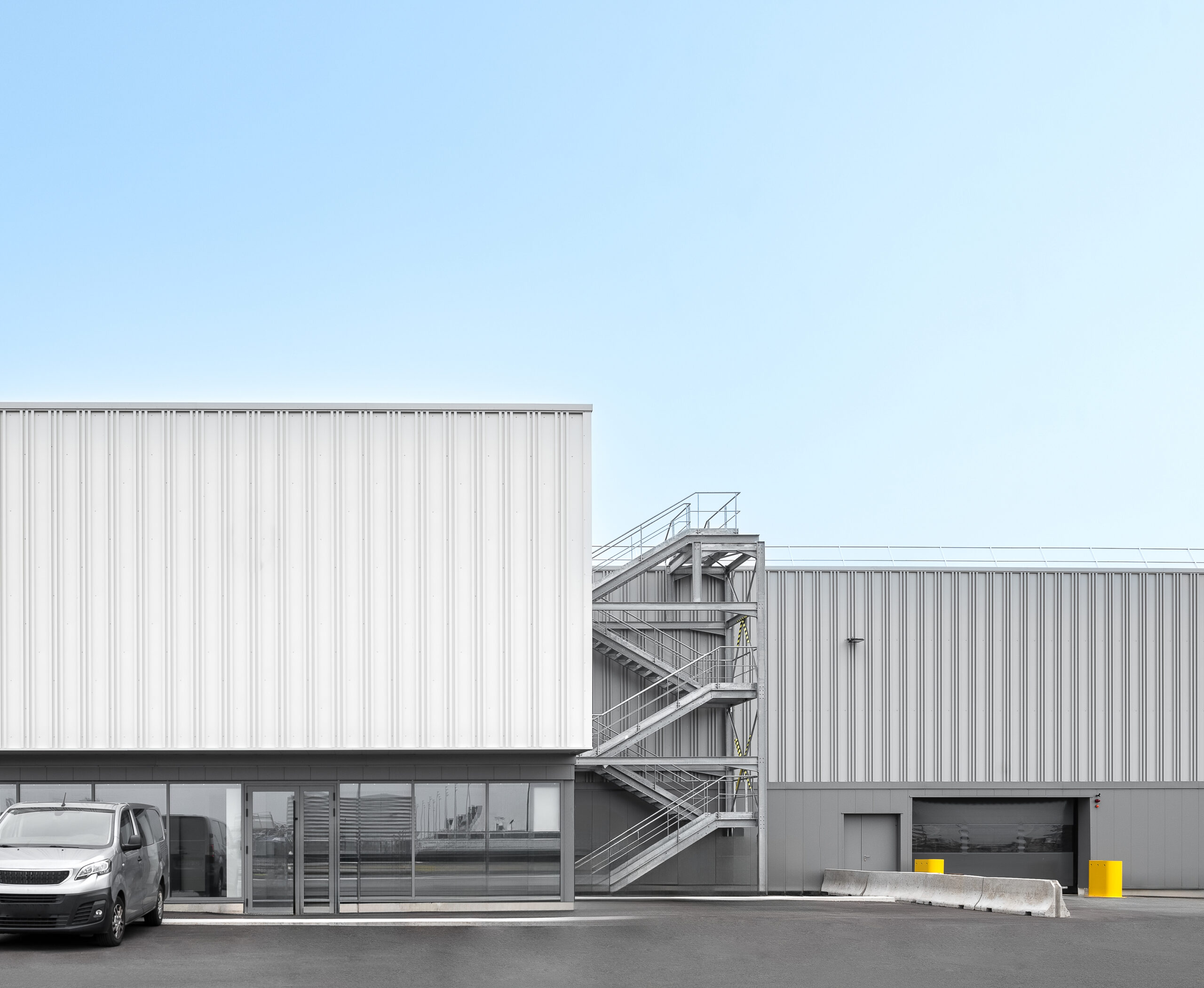 Derrière un volume de 9 mètres de hauteur, l’équipement concentre les fonctions industrielles du tri, doublées de locaux sociaux et administratifs sur deux niveaux en façade nord. L’écriture architecturale marque une rupture subtile entre les volumes : un porte-à-faux dynamique signale l’entrée, tandis qu’un jeu de bardages métalliques lisses et ondulés, déclinés en teintes de gris, vient rythmer les façades et casser l’effet monolithique du programme.