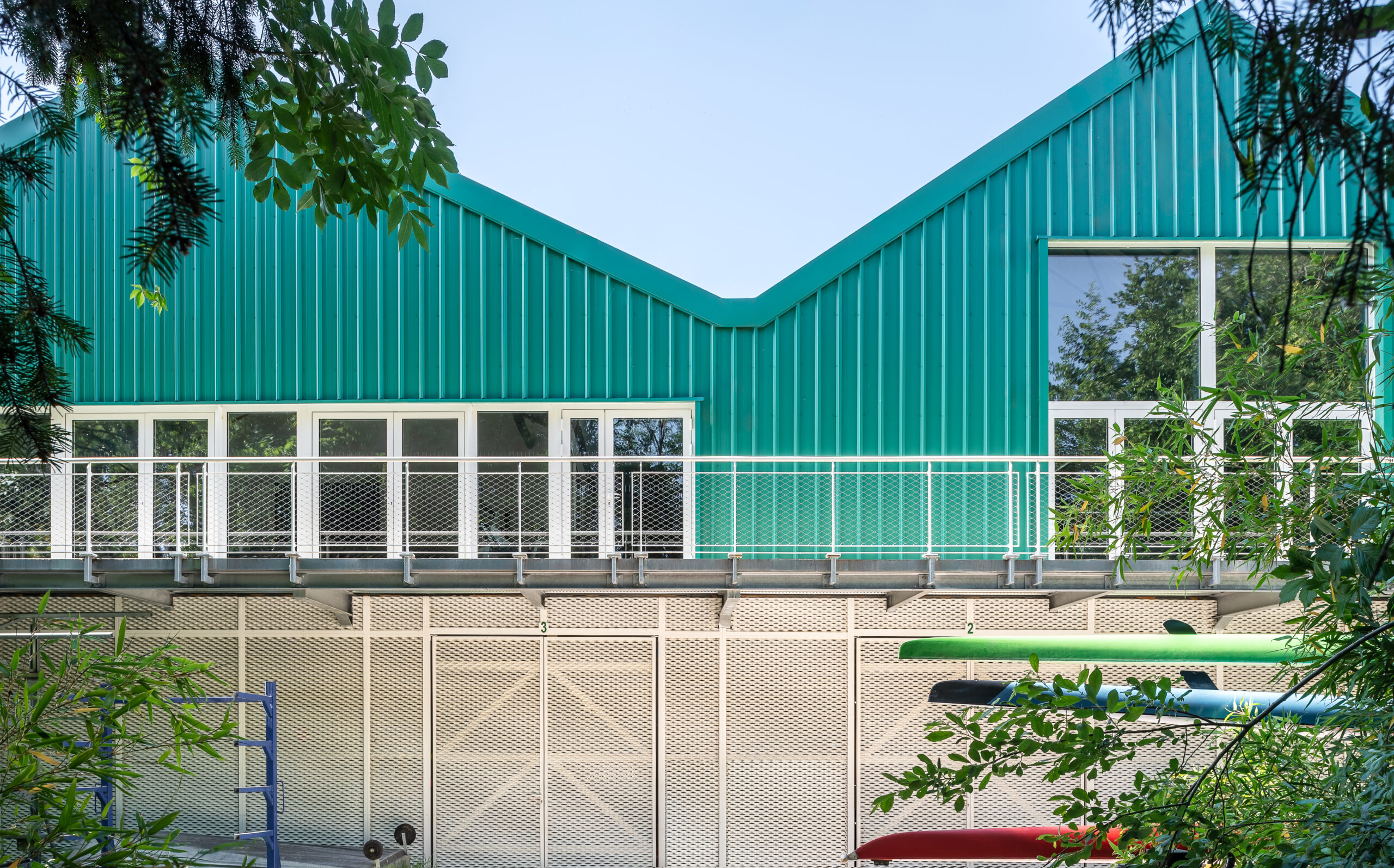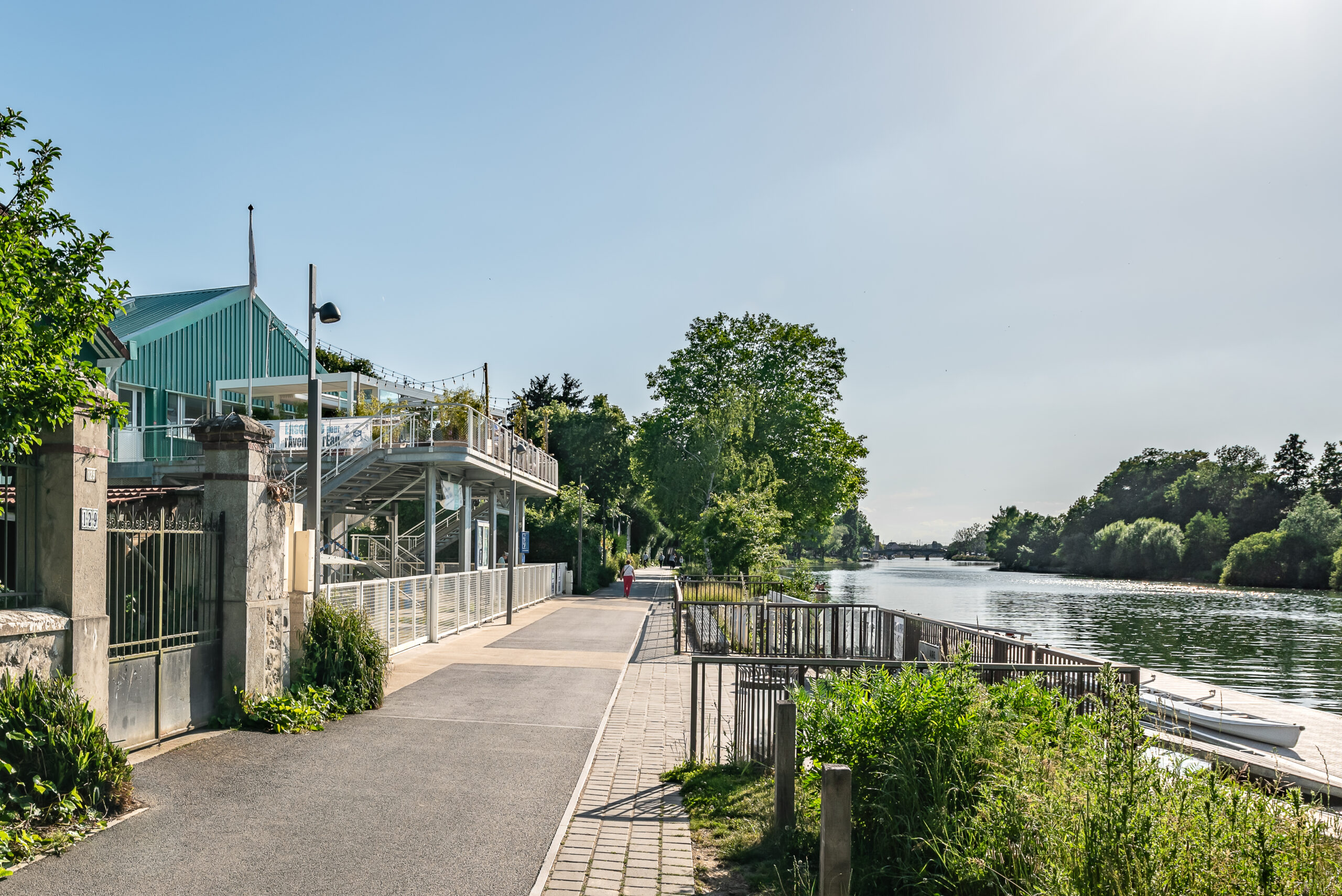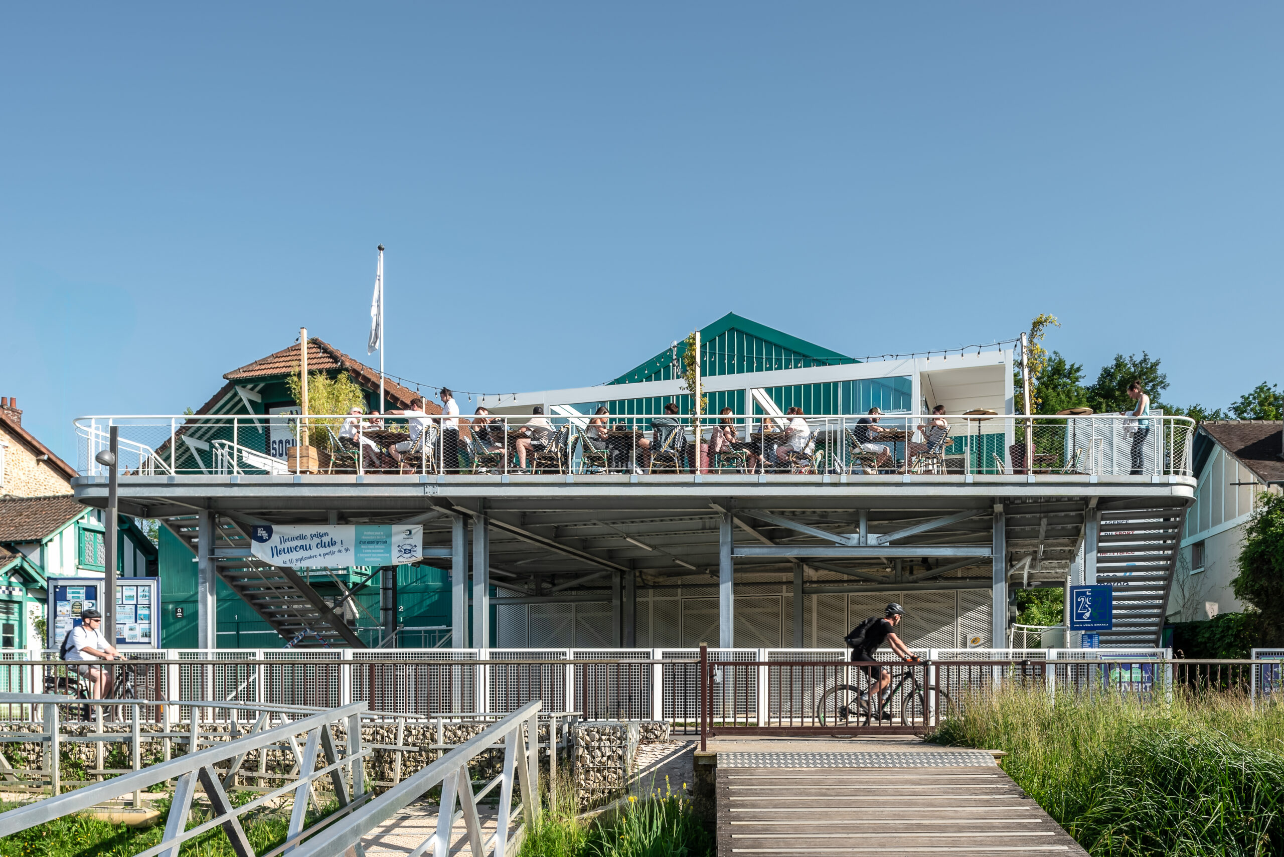 Le projet accueille le club d’aviron et un restaurant qui se déploi sur une large terrasse surplombant la Marne. Conçue sur pilotis pour anticiper les crues, cette plateforme devient un lieu d’observation et de convivialité, reliant le sport au paysage.