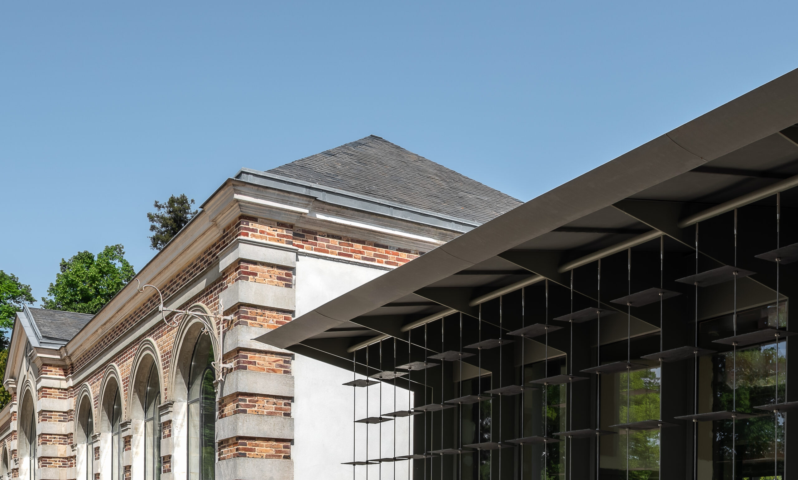L’extension se distingue par ses larges façades vitrées, offrant une transparence maîtrisée et protégée au sud par un ample débord de toiture et un brise-soleil innovant en ardoises suspendues sur câbles d’acier. Cette écriture contemporaine dialogue avec la matérialité de l’orangerie, mise en valeur par deux joints creux qui marquent l’articulation entre ancien et nouveau.