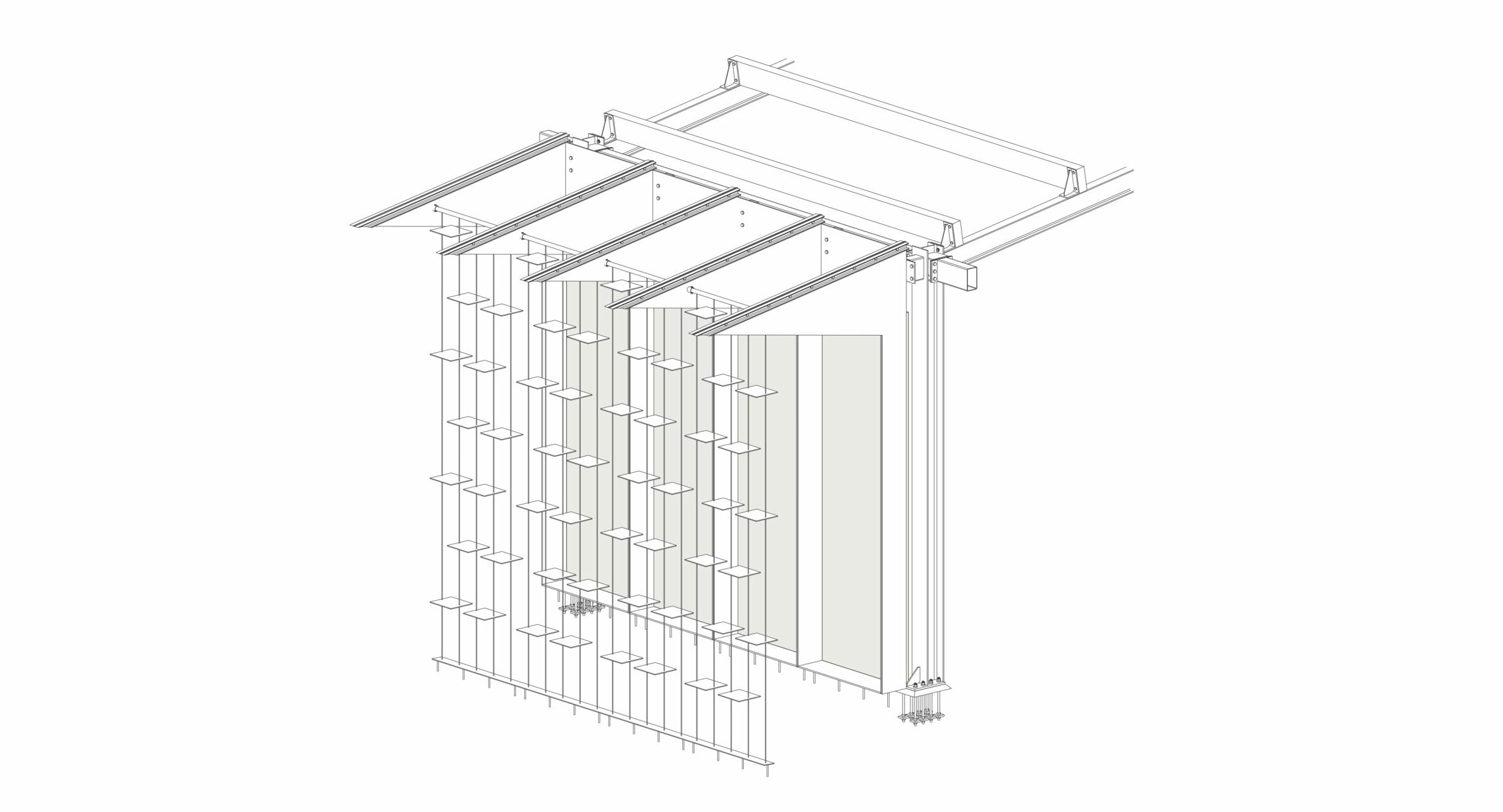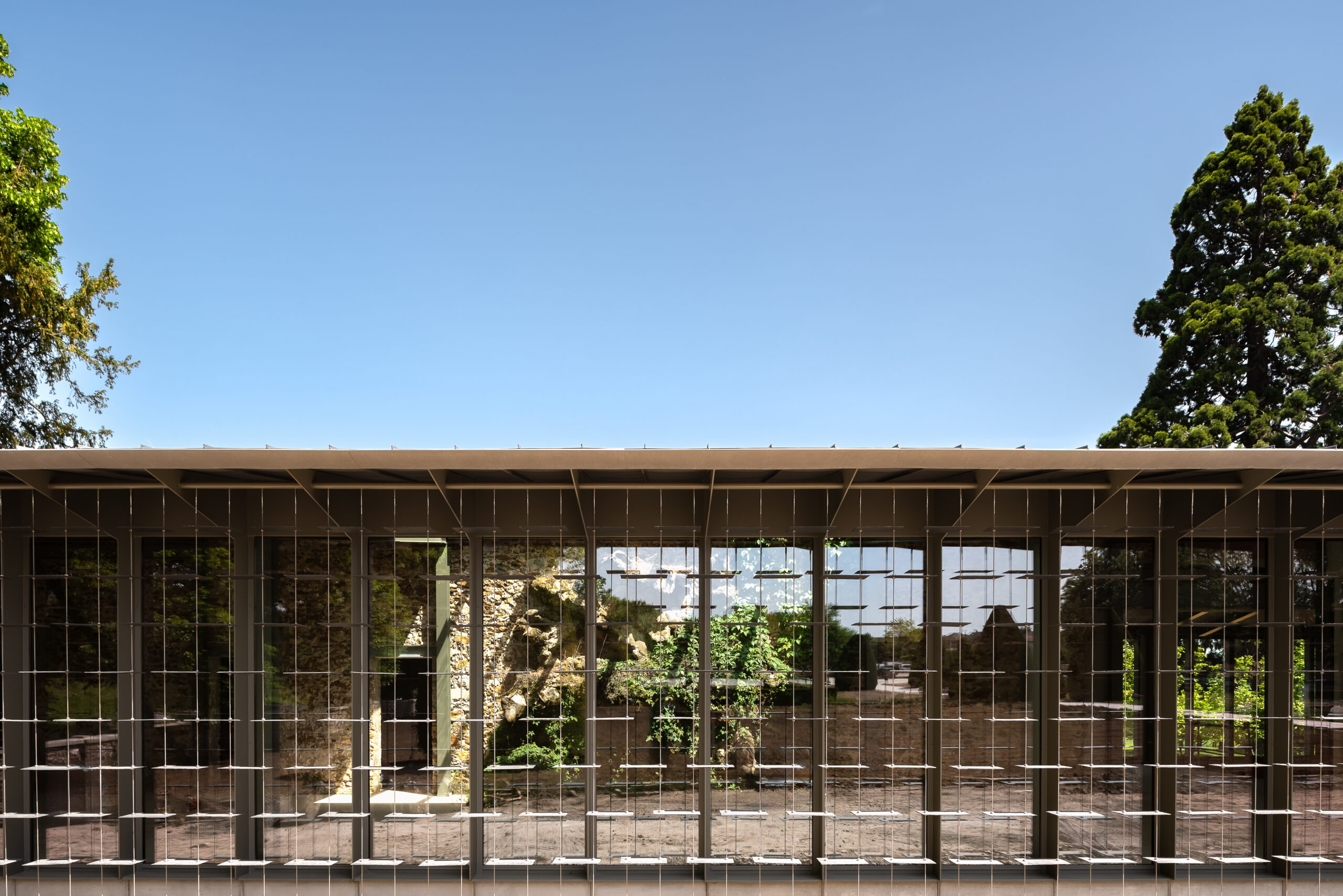 Conçu intégralement en métal, le nouveau volume se déploie de part et d’autre du mur en pierre qui clôturait autrefois le jardin potager du château. Cette implantation permet d’orchestrer un dialogue visuel entre l’entrée du parc, au sud, et les grands sujets arborés qui ponctuent l’horizon nord.