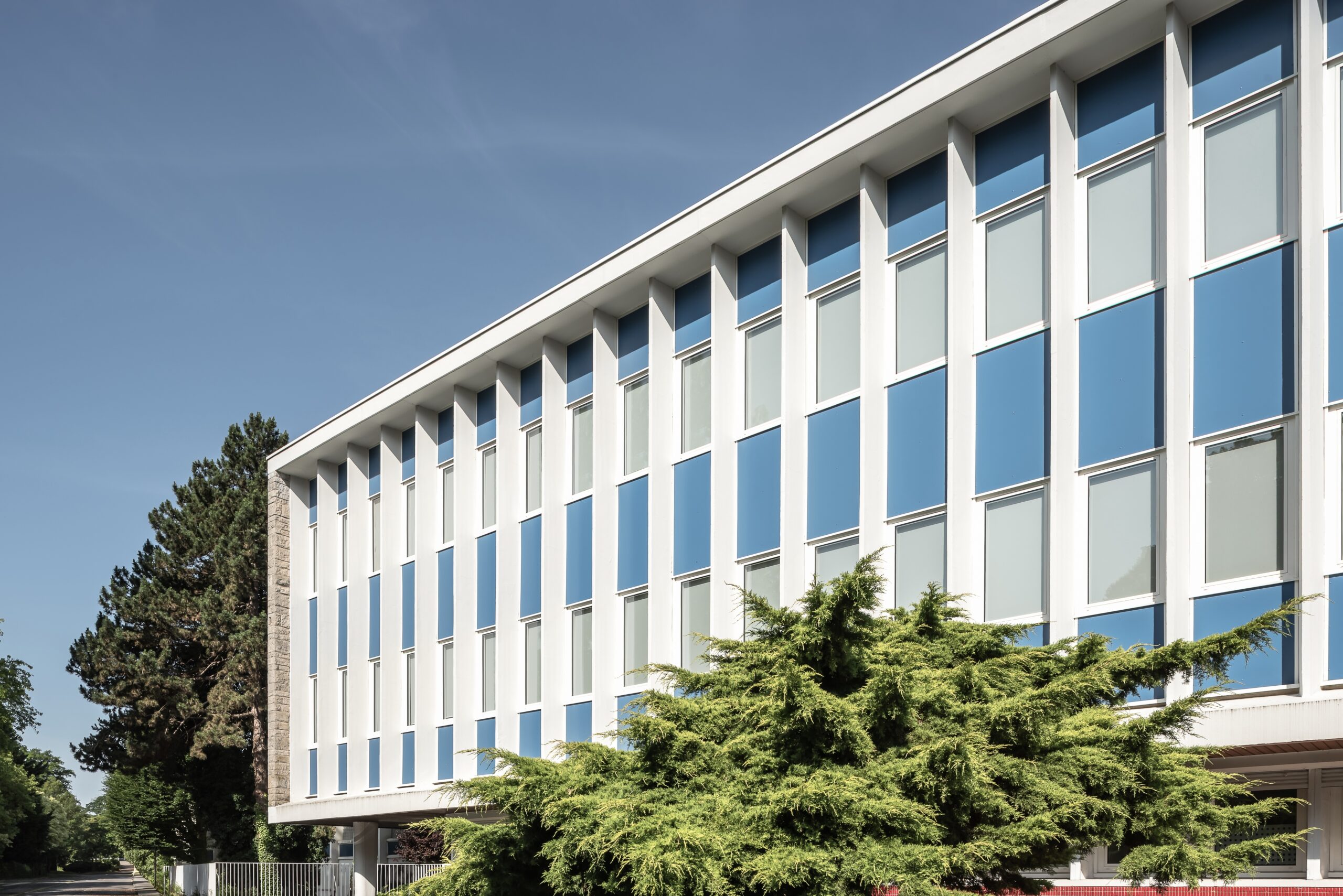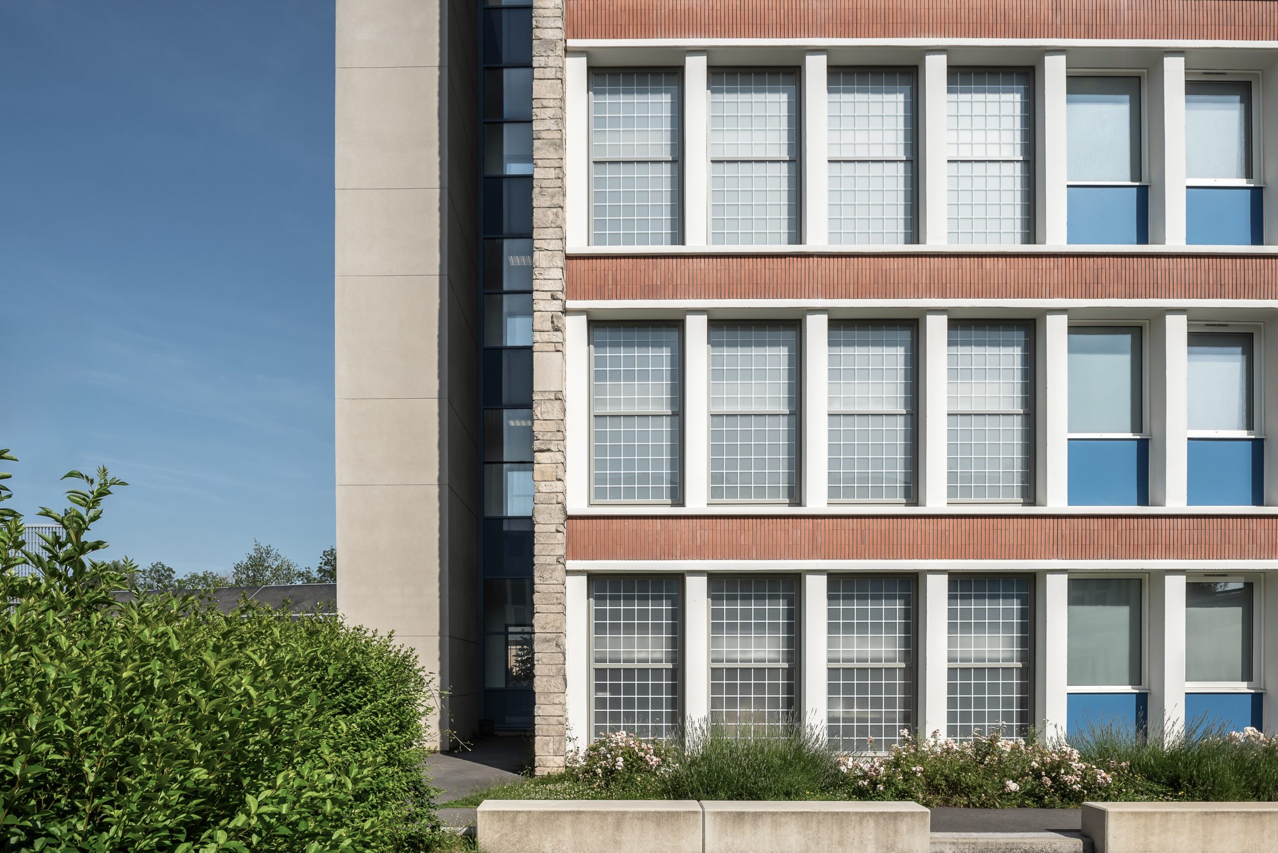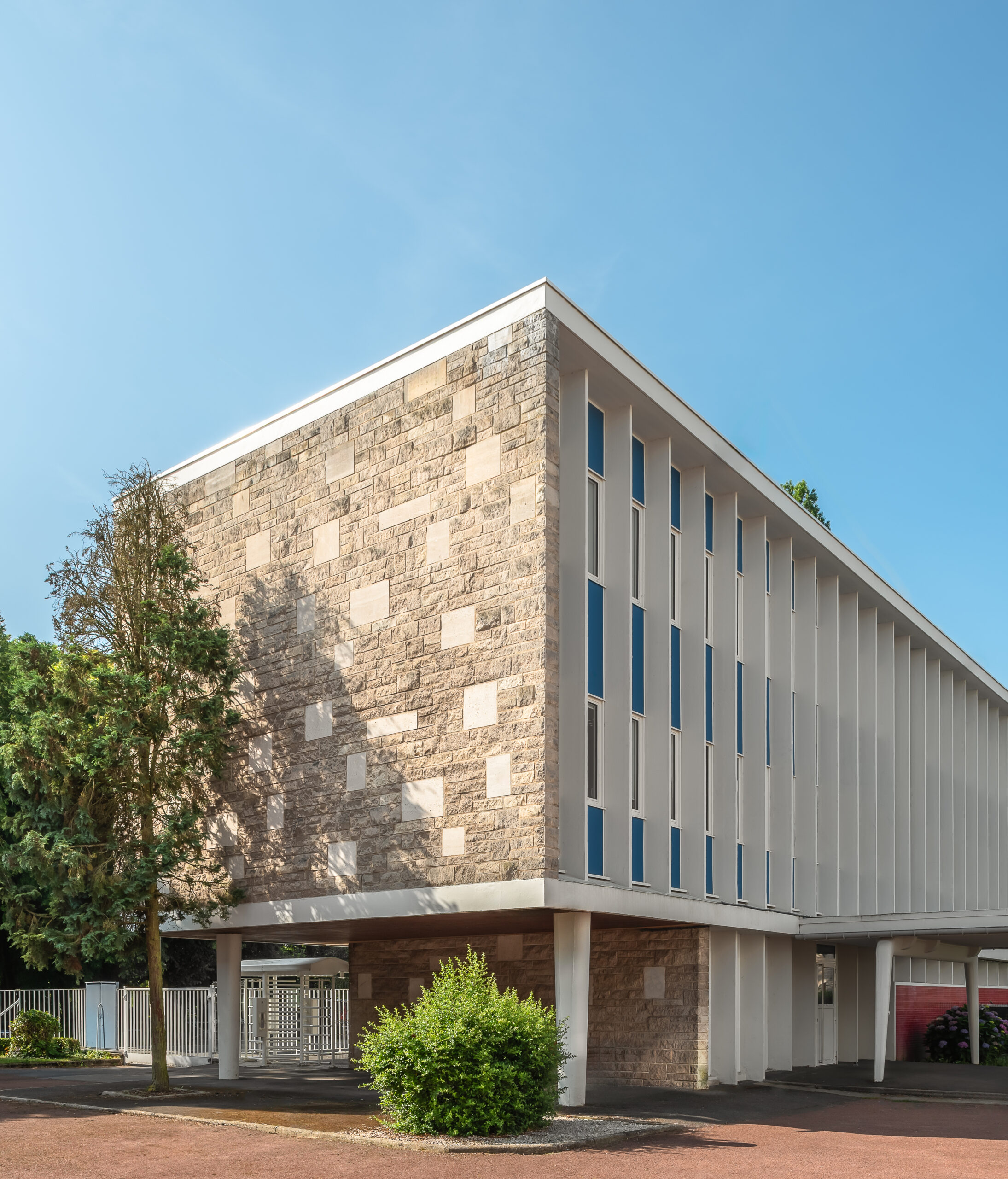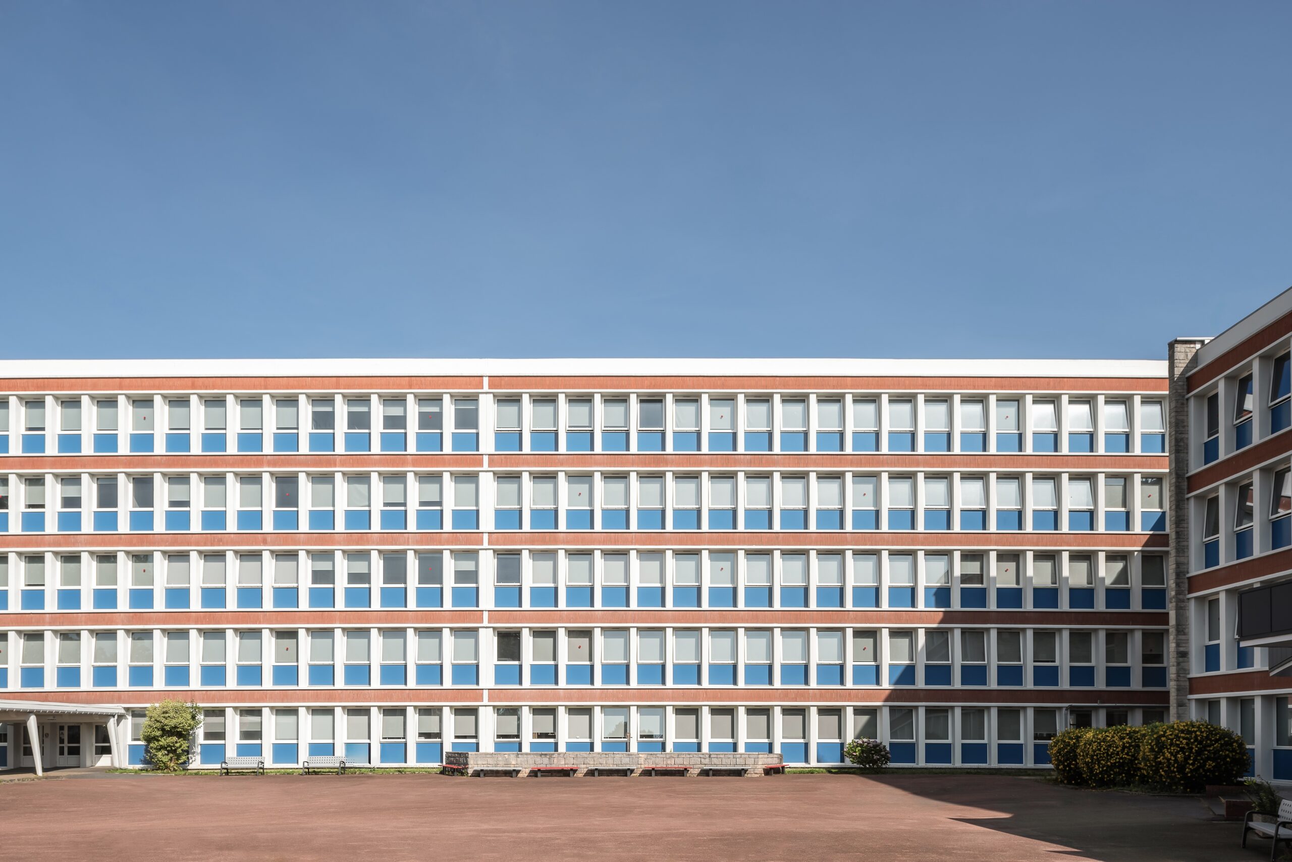 Inscrit dans un secteur classé, le projet a nécessité une concertation étroite avec les services des Bâtiments de France. Les choix techniques – châssis aluminium, doubles vitrages réfléchissants non émissifs, systèmes d’occultation intérieure et extérieure, allèges colorées – ont été guidés par une exigence double : préserver l’identité architecturale de l’établissement tout en répondant aux performances attendues d’un équipement éducatif du XXIe siècle.