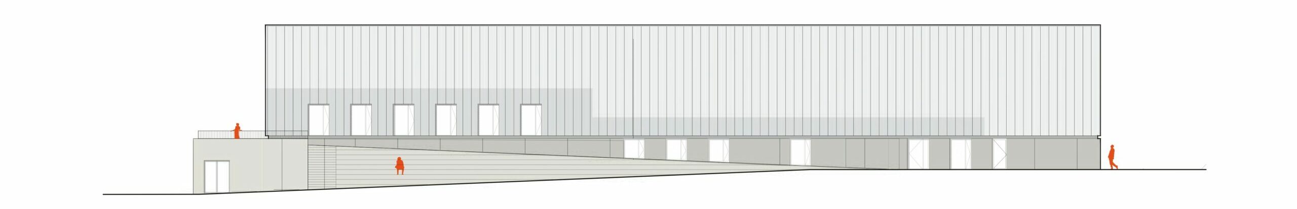 Le parti architectural s’appuie sur la topographie naturelle du site pour déployer une promenade en rampe reliant les différentes entrées. Ce parcours se termine par une terrasse-belvédère offrant un large point de vue sur le parc. Les variations de niveau générées par les rampes dessinent également des gradins extérieurs, transformant l’équipement en véritable arène lors des tournois.