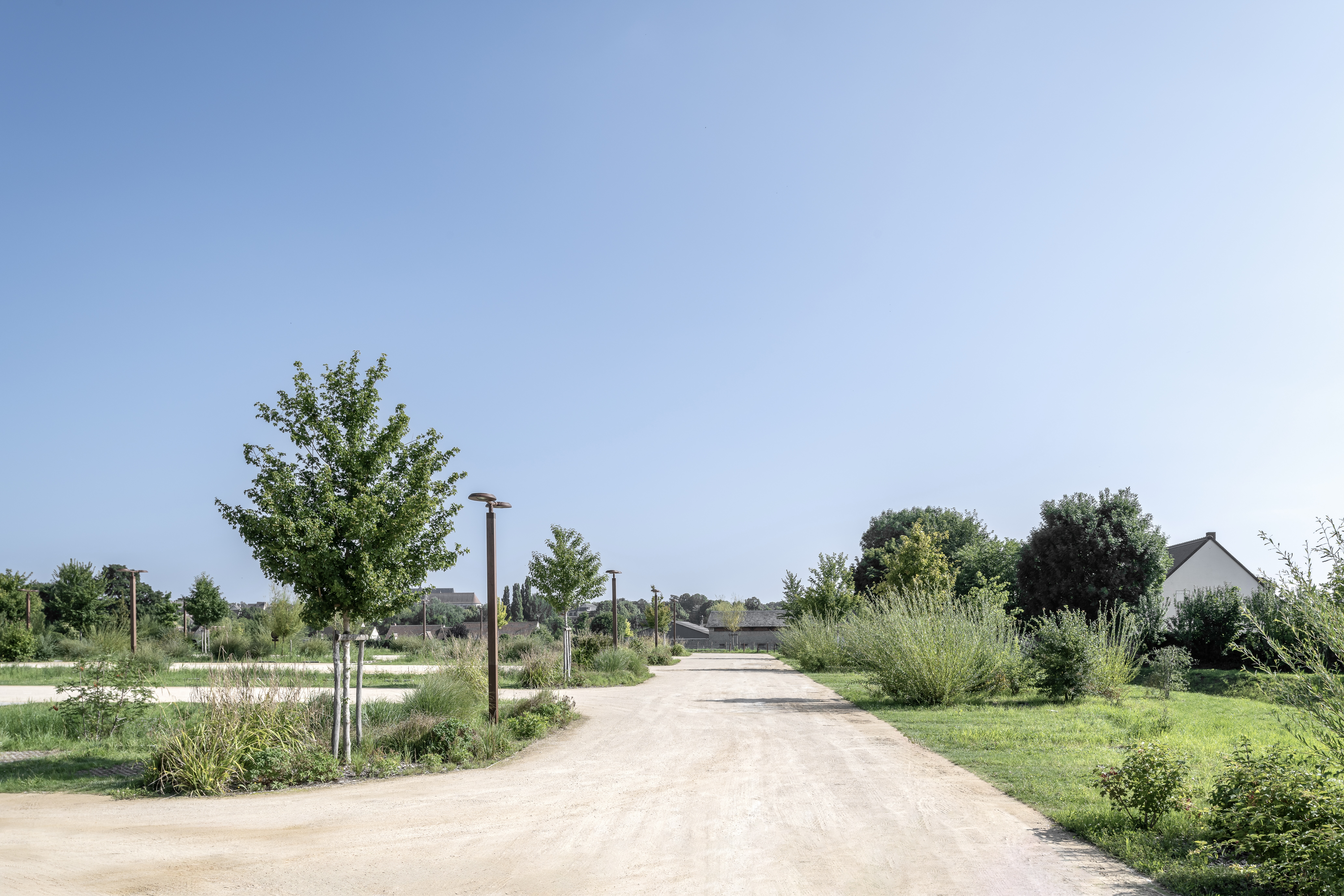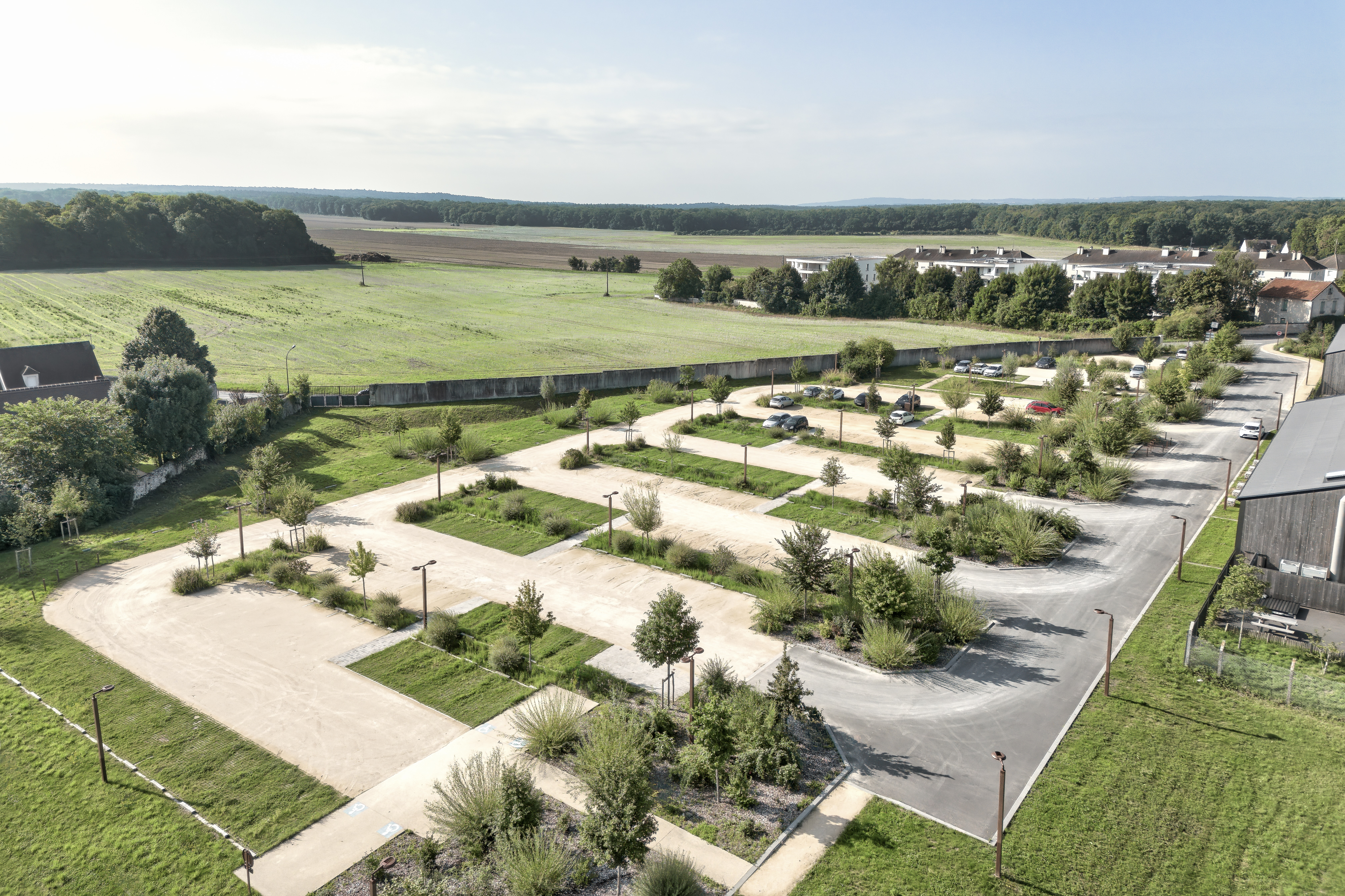 L’écriture, volontairement minimale, met en valeur la trame régulière du stationnement et le dialogue avec la végétation existante. Les alignements d’arbres, les noues plantées et le traitement des sols participent à une mise en scène du sol, absorbant les contraintes techniques — gestion des eaux pluviales, flux piétons et véhicules — tout en conférant une présence apaisée à l’ensemble.