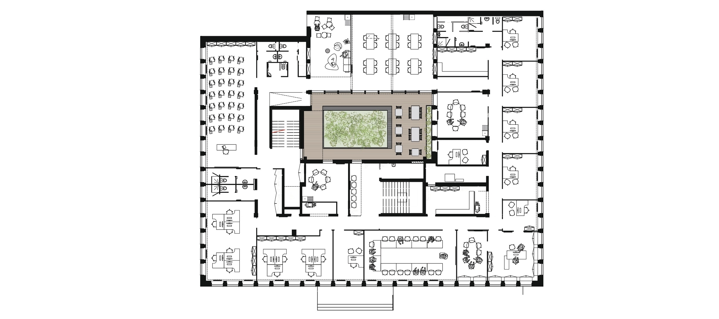 Le projet conserve la trame architecturale d’origine, enrichie par une intervention contemporaine qui souligne le rythme initial des façades. Une façade déportée optimise l’isolation thermique et le confort d’été des bureaux, tandis que l’extension, entièrement réalisée en ossature bois biosourcée, introduit légèreté et durabilité. L’approche environnementale se traduit par le réemploi de la structure et des matériaux existants, la mise en place de panneaux photovoltaïques, la récupération des eaux pluviales pour l’arrosage et le raccordement au réseau de chauffage urbain. Un patio planté en cœur d’îlot crée un îlot de fraîcheur et un espace de respiration pour les agents.