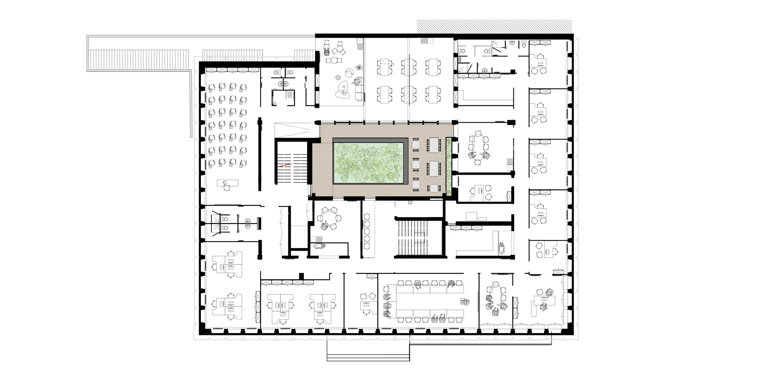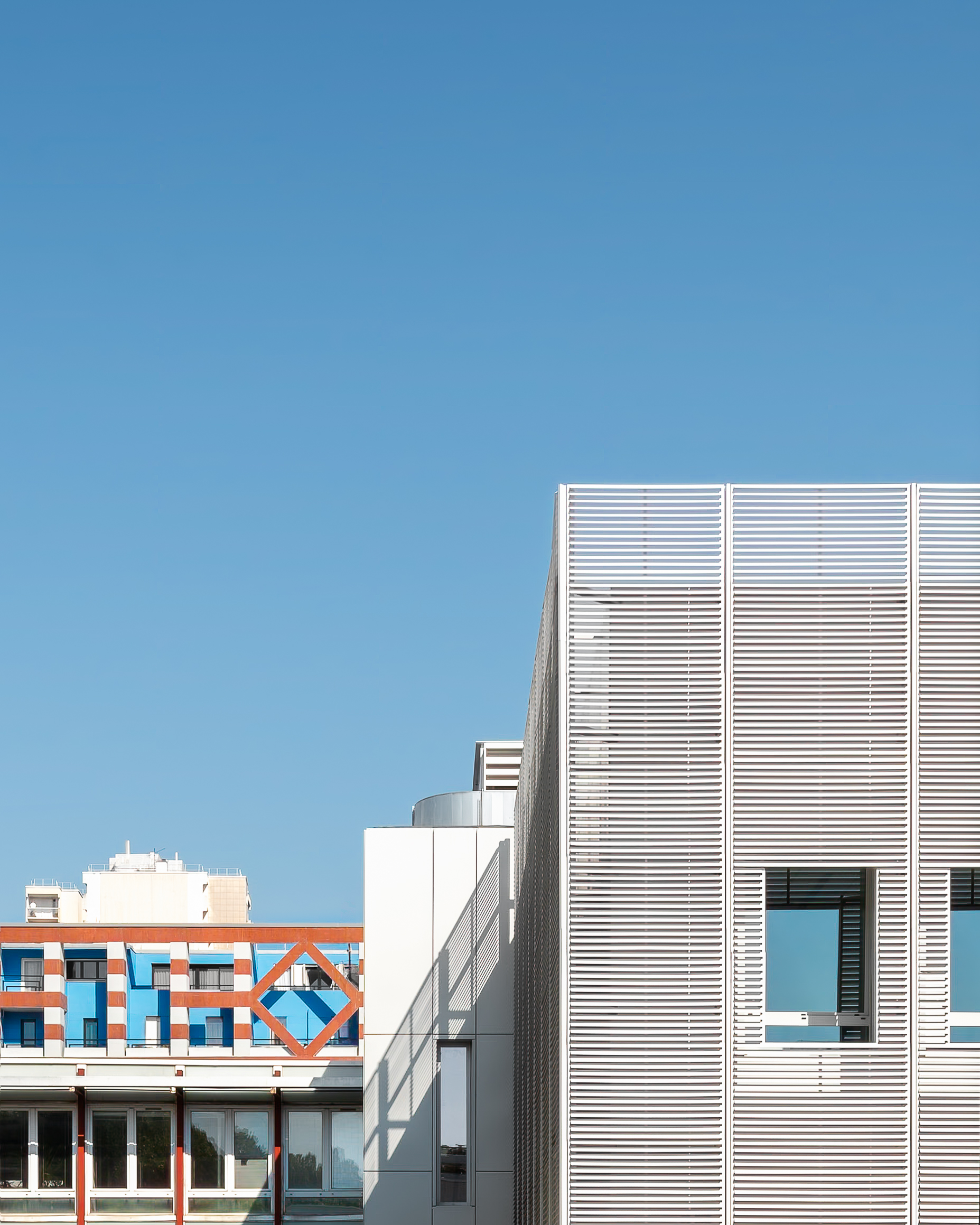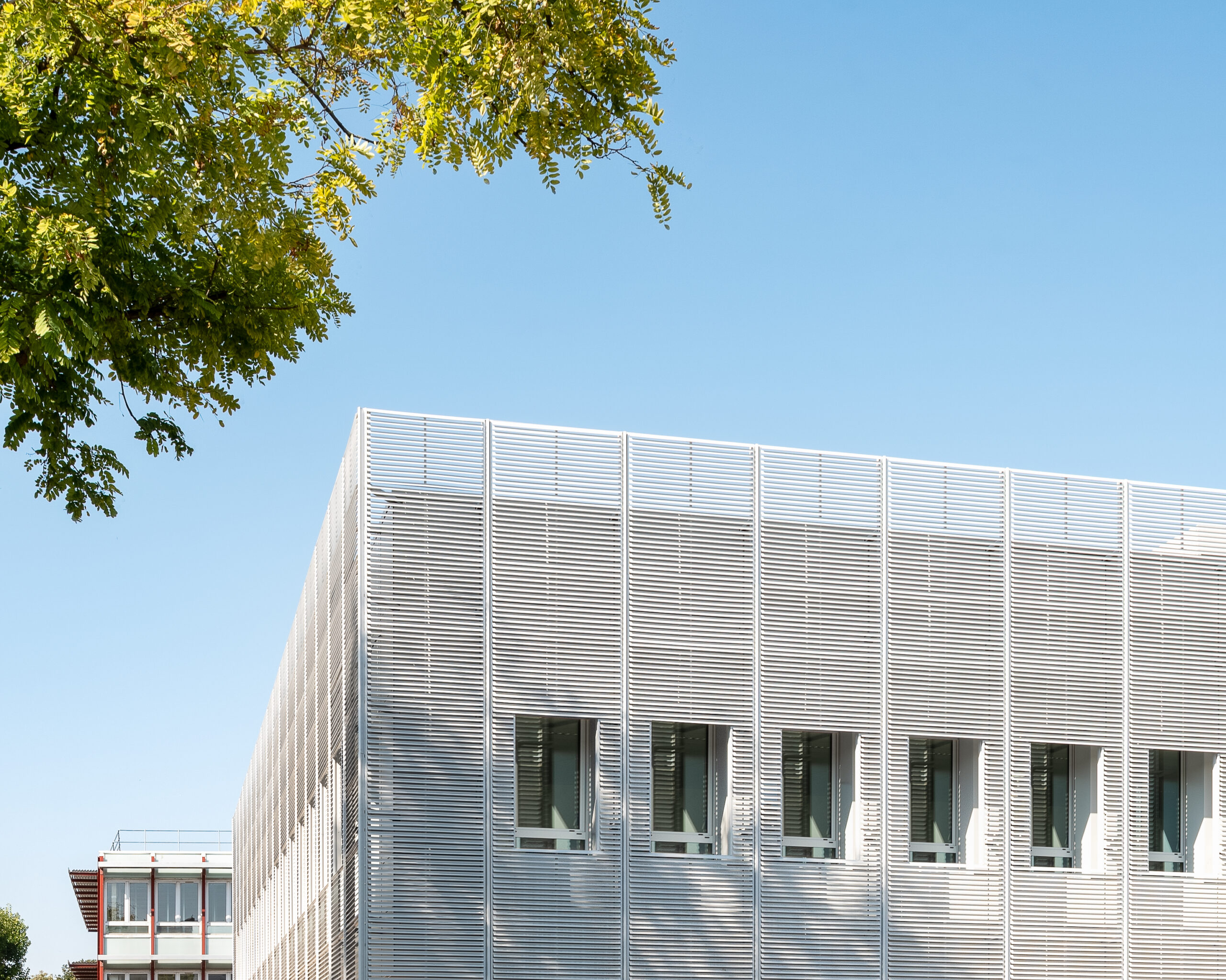 Le projet conserve la trame architecturale d’origine, enrichie par une intervention contemporaine qui souligne le rythme initial des façades. Une façade déportée optimise l’isolation thermique et le confort d’été des bureaux, tandis que l’extension, entièrement réalisée en ossature bois biosourcée, introduit légèreté et durabilité. L’approche environnementale se traduit par le réemploi de la structure et des matériaux existants, la mise en place de panneaux photovoltaïques, la récupération des eaux pluviales pour l’arrosage et le raccordement au réseau de chauffage urbain. Un patio planté en cœur d’îlot crée un îlot de fraîcheur et un espace de respiration pour les agents.