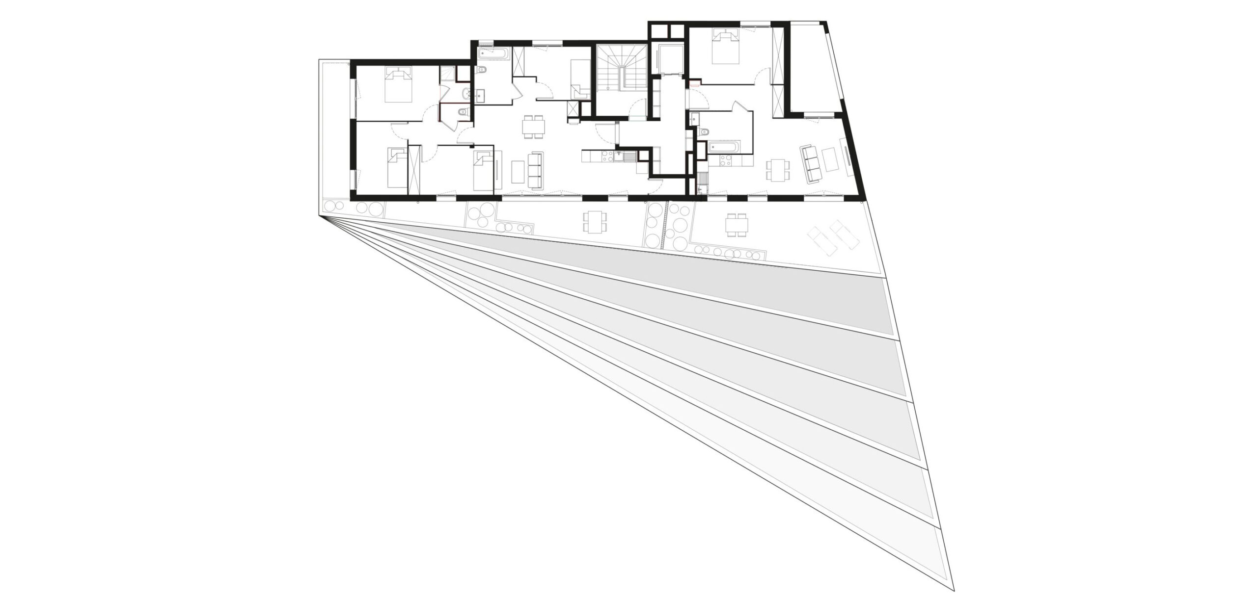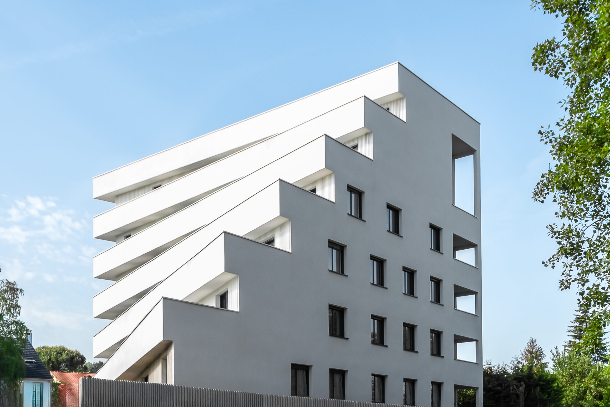 Au cœur de la ZAC Saint-Jean, le lot J occupe une position singulière, sur une parcelle en triangle qui ponctue la coulée verte. Ce rôle de repère urbain a conduit à imaginer un bâtiment de logements qui se déplie comme un éventail, offrant aux logements une large terrasse filante ouverte sur le grand paysage.
