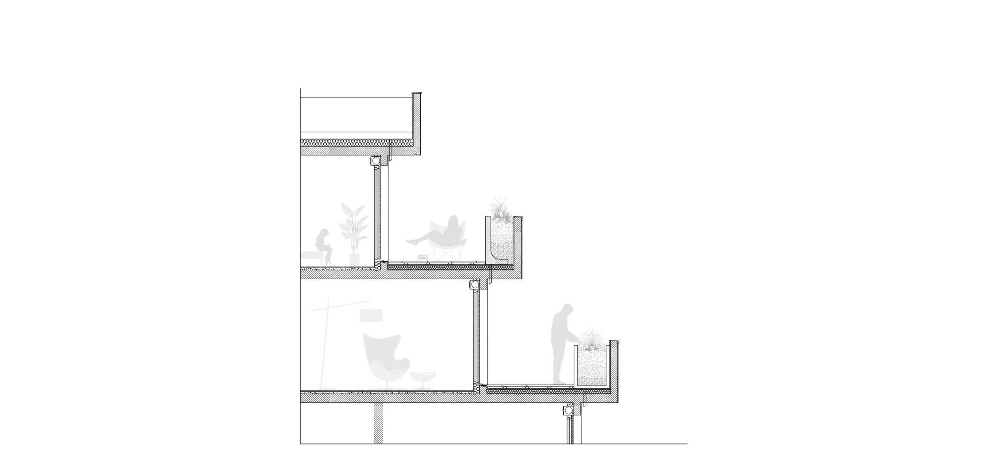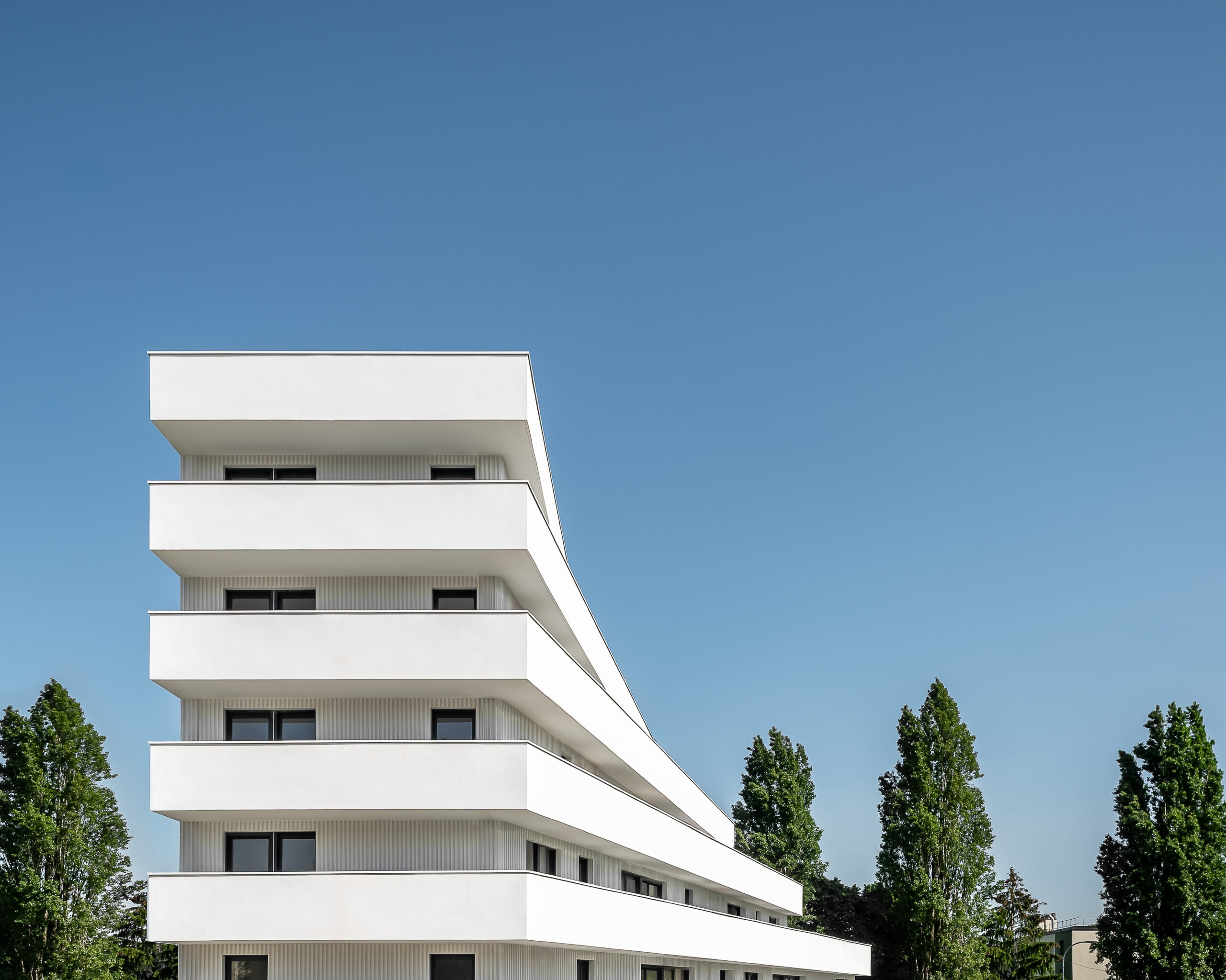L’architecture du projet s’appuie sur un socle en béton texturé, ancré dans le sol sur lequel vient se déployer les étages supérieurs monochromes, affirmant une écriture sobre et contemporaine. Ce contraste de matérialités accentu le parti pris sculptural de l’opération : faire du bâtiment un objet architectural habité et identifiable.