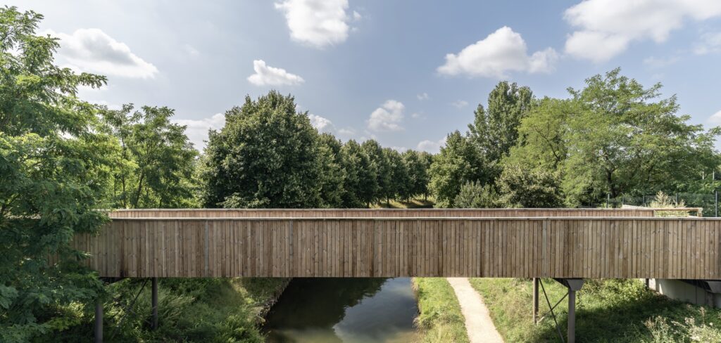 Inaugurée à l’occasion de la première fête du canal de l’Ourcq, la passerelle Roosevelt s’inscrit dans une politique ambitieuse de requalification des mobilités douces portée par la Ville de Meaux. Franchissant le canal dans son secteur nord, l’ouvrage relie directement les berges et les quartiers périphériques, jusque-là séparés par une infrastructure difficilement franchissable. Le projet s’affirme comme […]